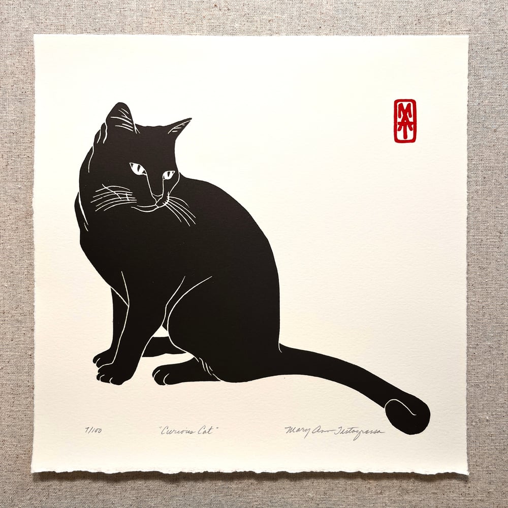 This is an original hand printed, linocut print, titled "Curious Cat." This is not a digital print.
