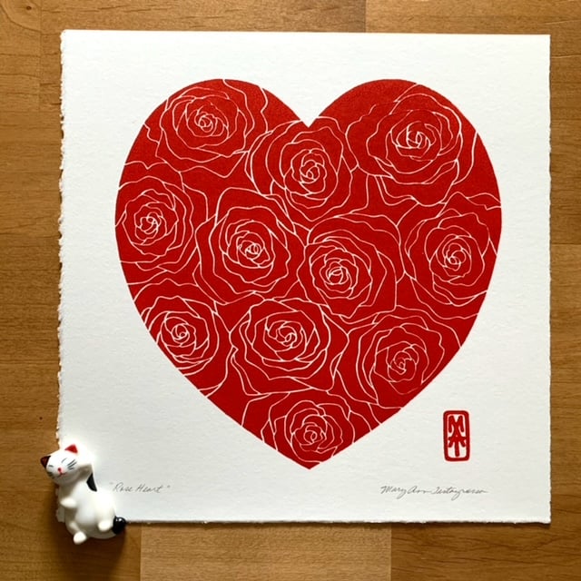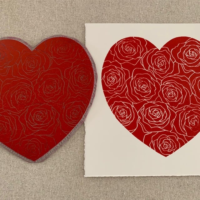 This is an original hand printed, linocut print, titled "Rose Heart." This is not a digital print.